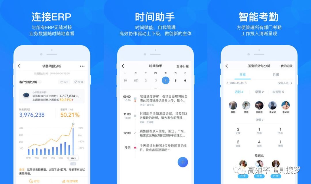 你可以把它当做时间助手,还有连接ERP 的报表。同时文件管理,审批,签到等功能。