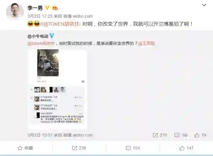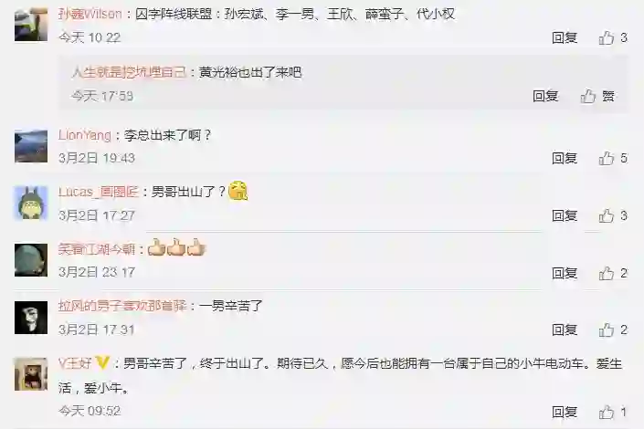 到了当天下午 5 点 23 分,牛电科技创始人李一男也更新了狱后的首条微博,转发的是小牛电动和牛电科技创始人胡依林的微博,并附上了两个大笑表情。据悉,2017 年 12 月,李一男出狱还参加了小牛电动的 2018 年会。