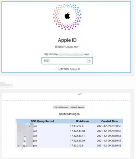 例如,在下面的截图中,攻击者将构造的字符串作为用户名来登录 iCloud 账户。显然,这个字符串进入了 iCloud 服务器的日志中,进而触发漏洞,访问了字符串中所包含的域名: