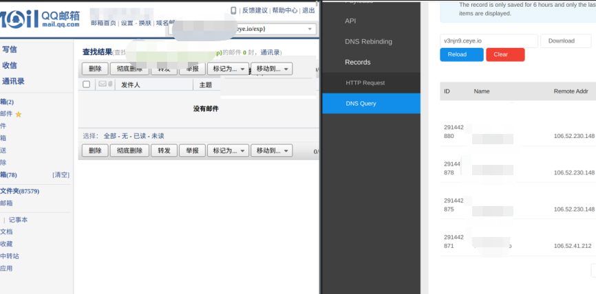 类似地,在下面的 QQ 邮箱截图中,攻击者将构造的字符串填进了邮箱的搜索框,同样导致了腾讯服务器被记录:
