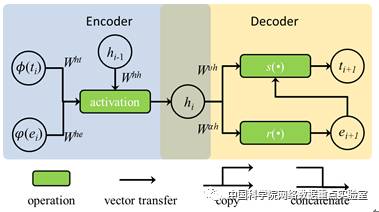 我们借助于循环神经网络来实现这种转换,对于时空建模而言,输入:已观测的事件序列,输出:下一事件。输入和输出的形式都是事件,循环神经网络的作用是将输入进行编码,继而再做解码还原为事件描述输出。由于需要统一时间和空间,人为的方式难以定义这种编解码的过程,因此藉以能够通过循环神经网络去寻找。图1展示了一个利用循环神经网络对时空建模的基本框架:左侧为编码过程,右侧为解码过程。图中的t,e分别表示时间和空间变量,在编码前,我们预先对时间和空间进行Φ(t)和φ (e)转换,使之能够作为神经网络的输入;编码过程的输出,我们称为表达h,作为解码过程的输入,通过函数s和r做解码变换确定下一可能发生的事件。可以发现,表达h是连接编解码过程的关键,是统一时间和空间的一结果。