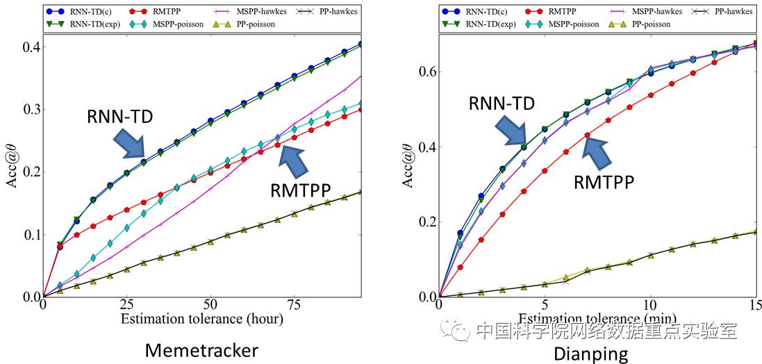 我们在两个实验数据集上比较前后两种框架的差异性:一组为用户博客数据(Memetracker),一组为大众点评的团购消费数据(Dianping)。我们分别采用两种框架用来预测下一事件的发生时间,并将其精度展示于图4中。可以看到,考虑解码过程中时间和空间关联关系的后一种框架(RNN-TD),其在预测精度上优于不考虑这种关联关系进行解码的框架(RMTPP)。也就是说,这条增加的连接关系是确实有效的。