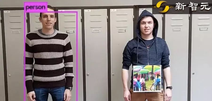 如上图所示,AI 系统成功检测到左边的人,而右边的人被忽略了。右边的人身上挂着一块彩色纸板,在论文中被称为 “对抗性补丁”(adversarial patch),正是这块补丁 “欺骗” 了 AI 系统,让系统无法发现画面中还有一个人。