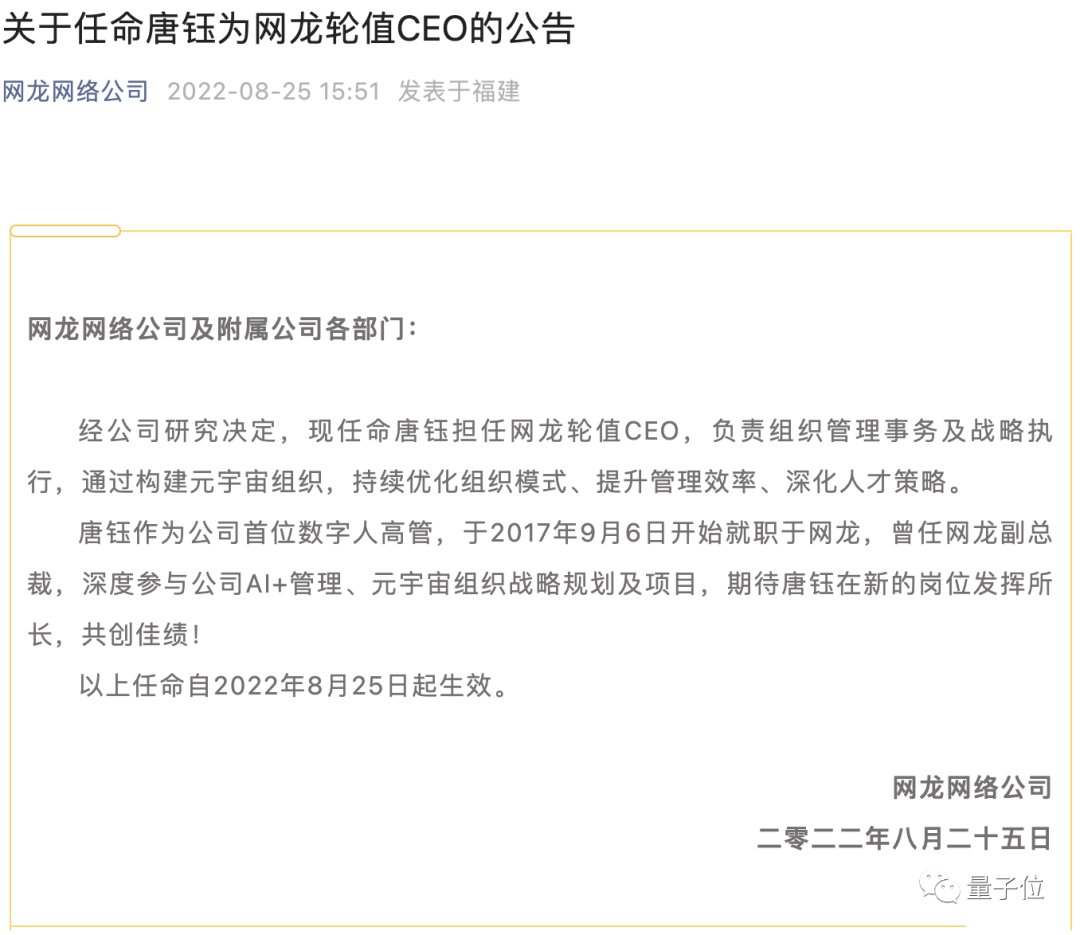 最近,港股上市公司网龙网络宣布任命唐钰为公司轮值CEO,负责组织管理事务及战略执行等工作。