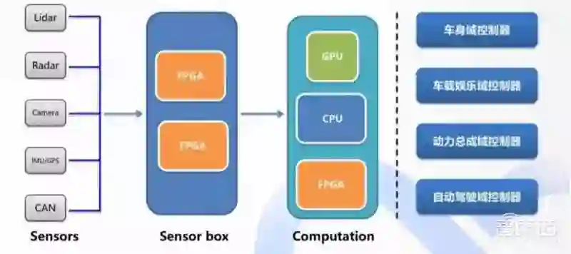 百度 Apollo:恩智浦/英飞凌/瑞萨 MCU+赛灵思 FPGA/英伟达 GPU。百度无人驾驶样车采用 IPC(Industrial Personal Computer,工控机)方案,但工控机的体积和功耗难以满足量产化要求,因而百度也推出了适合于量产的域控制器嵌入式方案。将各个传感器的原始数据接入到 Sensor Box 中,在 Sensor Box 中完成数据的融合,再将融合后的数据传输到计算平台上进行自动驾驶算法处理。百度自动驾驶专用计算平台 ACU(Apollo Computing Unit)定义了三个系列产品:MLOC(高精定位,MCU)、MLOP(高精定位+环境感知,MCU+FPGA)、MLOP2(高精定位+环境感知+决策规划,MCU+GPU)。