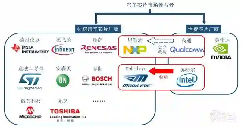 主控芯片巨头具有较强的 AI 计算优势,功能芯片厂商具有丰富的汽车产业链经验,两大阵营之间兼并收购及联盟合作频发。截至目前,英伟达已与全球 370+整车厂、一级供应商达成合作;英特尔收购 Mobileye 切入汽车产业;高通曾意图收购恩智浦等。
