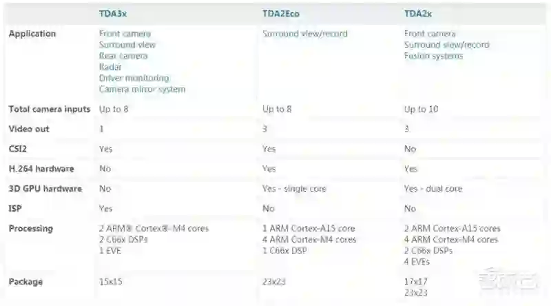 解决方案。TDA2x 于 2013 年 10 月发布,主要面向中到中高级市场,配置了 2 颗ARM Cortex-A15 内核与 4 颗 Cortex-M4 内核、2 颗 TI 定浮点 C66xDSP 内核、4颗 EVE 视觉加速器核心,以及 ImaginationSGX544GPU,主要应用于前置摄像头信息处理,包括车道报警、防撞检测、自适应巡航以及自动泊车系统等。TDA3x于2014 年 10 月发布,主要面向中到中低级市场,其缩减了包括双核 A15 及SGX544GPU,主要应用在后置摄像头、2D 或 2.5D 环视等,可支持车道线辅助、自适应巡航控制、交通标志识别、行人与物体检测、前方防碰撞预警和倒车防碰撞预警等多种 ADAS 算法。