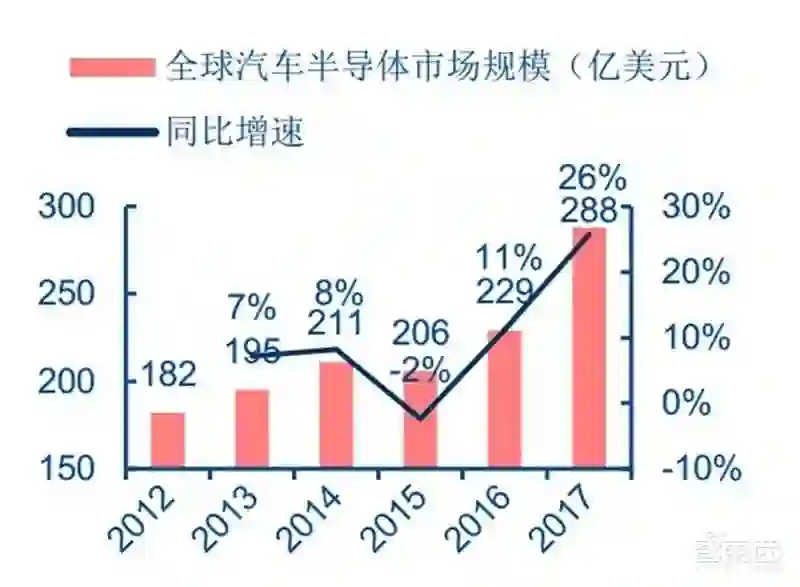 智能驾驶涉及人机交互、视觉处理、智能决策等,核心是 AI 算法和芯片。伴随汽车电子化提速,汽车半导体加速成长,2017 年全球市场规模 288 亿美元(+26%),远高于整车销量增速(+3%),其中占比最高的为功能芯片 MCU(66 亿美元,占比 23%),随后还包括功率半导体(21%)、传感器(13%)等。