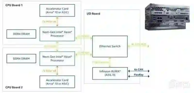 谷歌 Waymo :采用英特尔 CPU+Altera FPGA 方案,英飞凌 MCU 作为通信接口。谷歌 Waymo 的计算平台采用英特尔 Xeon 12 核以上 CPU,搭配 Altera 的 Arria