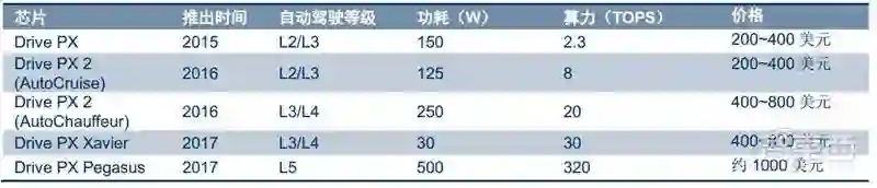 特斯拉:从 Mobileye ASIC 到英伟达 GPU。2014 年特斯拉发布 Autopilot 1.0,搭载 1 个前置摄像头、1 个后置倒车摄像头(不参与辅助驾驶)、1 个前置雷达、12个超声波传感器,视觉芯片采用 MobileyeEyeQ3,主控芯片采用 NVIDIA Tegra 3。2016 年底特斯拉发布 Autopilot 2.0,搭载 3 个前置摄像头(不同视角广角、长焦、中等)、4 个侧边摄像头(左前、右前、左后、右后)、1 个后置摄像头、1 个前置雷达(增强版)、12 个超声波传感器(传感距离增加一倍),主控芯片采用NVIDIADrive PX 2,处理速度为 Autopilot 1.0 的 40 倍。