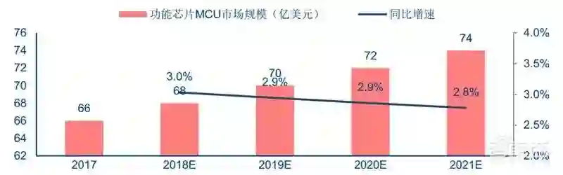 汽车半导体按种类可分为功能芯片 MCU(Microcontroller Unit)、功率半导体(IGBT、MOSFET 等)、传感器及其他。根据Strategy Analytics,在传统燃油汽车中,MCU 价值量占比最高,为 23%;在纯电动车中,MCU 占比仅次于功率半导体,为 11%。DIGITIMES 预测,功能芯片 MCU 市场规模有望从2017 年 66 亿美元稳步提升至 2020 年 72 亿美元。