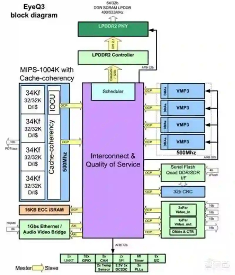 视觉芯片:S32V234 视觉处理器,拥有 CPU(4 颗 ARM CortexA53 和 1 颗 M4)、3D GPU(Vivante GC3000)和视觉加速单元(2 颗 APEX-2vision accelerator),支持4 路摄像头。可用于前视摄像头、后视摄像头、环视系统、传感器融合系统等,能实时 3D 建模,计算能力为 50GFLOPs。同时,S32V234 芯片预留了支持毫米波雷达、激光雷达、超声波的接口,可实现多传感器数据融合,最高可支持 ISO26262ASIL-C 标准。