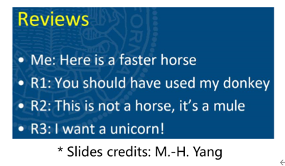下图来自Ming-Hsuan Yang教授的Slides,生动、形象地描述了作者和3位审稿人在Rebuttal阶段可能存在的矛盾冲突:投稿人自觉论文写的是“这匹马跑得更快”,结果审稿人1说“你应该使用我的驴”、审稿人2说“这不是马,这是骡子”、审稿人3说“我想要的是一头独角兽!”。面对如此情形,你该怎么办?在Rubuttal里面愤慨地直接把审稿人“怼”回去吗?当然不能这样,毕竟投稿人和审稿人是处于一种不对等的地位,我们需要的是端正心态,用平和、专业的态度去把道理解释清楚。