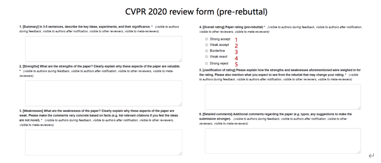 审稿人阅读完投稿的论文之后,会填写评审意见的表格(CVPR 2020年的示例如下图),这也是论文作者在Rebuttal开始时候会收到的评审意见。第一部分的Summary,是一些总结的套话,一般不直接反映审稿人的态度。比较重要的是第二部分的Strengths和第三部分的Weaknesses的部分。一般而言,如果Strengths部分内容多,那么审稿人会在第四部分Overall rating会倾向于Weak accept以上的分数;如果Weakness部分内容比较多,则会倾向于Weak reject以下的分数。第五部分的Justification of Rating,会给出勾选相应分数的解释。