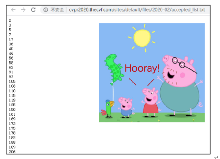 AC Meeting结束后,录取ID也随之确定,我们便可以去网上查看录取结果。这个“神秘”的txt文件(不包括图里的Peppa Pig^_^)一般会早于在投稿系统上可以查询具体的Meta review(AC给出的解释文章最终结论的一段话)和Oral/Poster决定的时候就会公开。