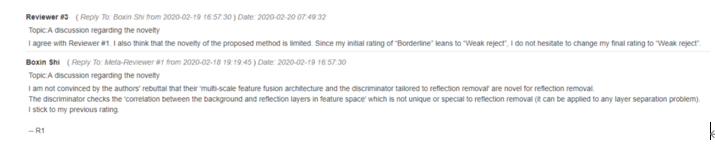 当Reviewer收到Rebuttal之后,会重新审视论文,并且进行一场彼此匿名的讨论——这也是Rubuttal很重要的原因之一,它意味着起初的判断可能发生改变:因为在这样的讨论中,某个匿名审稿人发表的意见可能会对其他审稿人的判断产生影响,甚至主导讨论的“节奏”。