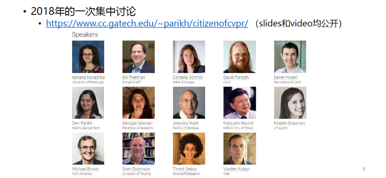 从如何写好计算机视觉论文的角度,我推荐大家去看MIT Bill Freeman教授的《How to write a good CVPR submission》[4]、UC Merced Ming-HsuanYang教授的《How to get your CVPR paper rejected》[5]。前者对一篇好的CV论文的每个章节做了解析,还有一些改写的例子;后者是我这次报告主要借鉴的一份资料,包含了CV论文处理的流程。另外重点推荐一个300多分钟的会议视频(网址如下图)和PPT,这是2018年国际CV领域一批顶尖大佬们在CVPR 18一个Workshop上就做一个好的计算机视觉社区“公民”的集中讨论,讨论话题囊括了从做好研究、写论文、投稿和审稿等整个闭环。