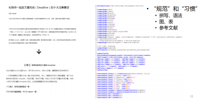 具体而言,我建议大家在写论文之前,阅读一下杜克大学陈怡然教授写的《和导师一起赶文章死线(Deadline)的十大注意事项》。文章中谈到一个很基本的点,便是首先要熟悉使用论文写作工具和模板(Template),这有助于我们快速掌握写作规范和习惯。例如,句子中的人称及单复数,是论文写作中很容易出错的“重灾区”,但通过相关工具的辅助,以及一定良好习惯的训练,会帮助你在写作中能有效地规避这些问题,也使得导师在修改你的论文时心情愉悦,当然审稿人(Reviewer)在评审论文时也容易留下一个比较好的第一印象。