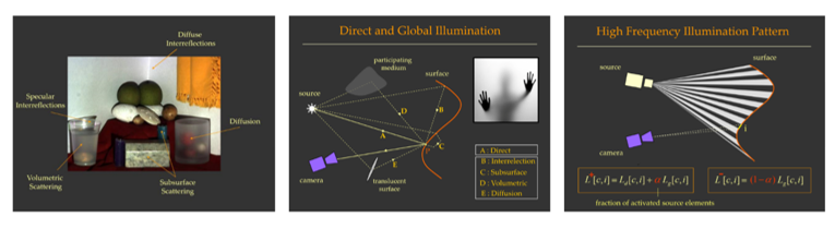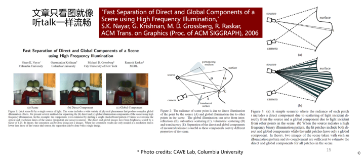 作者做的是一个“全局和局部光照分离”的研究,第1张图提供了包含各种光传播现象的场景;第2张图画出了上述场景的几种光传播现象对应的简单光路图;第3张图则是用形象的图例和简单的方程描述怎么做光分离:如何通过改变一个黑白相间的条纹投影,获取全局光照前面的系数变化,从而建立方程组,求解分离问题。