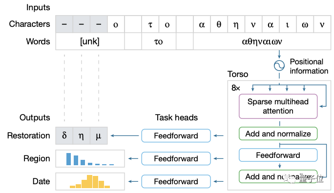 其输入随后被传递给三个分别负责文字修复、地理归属、时间归属的任务头,每个头都由一个前馈的神经网络组成,专门负责各自任务的训练。