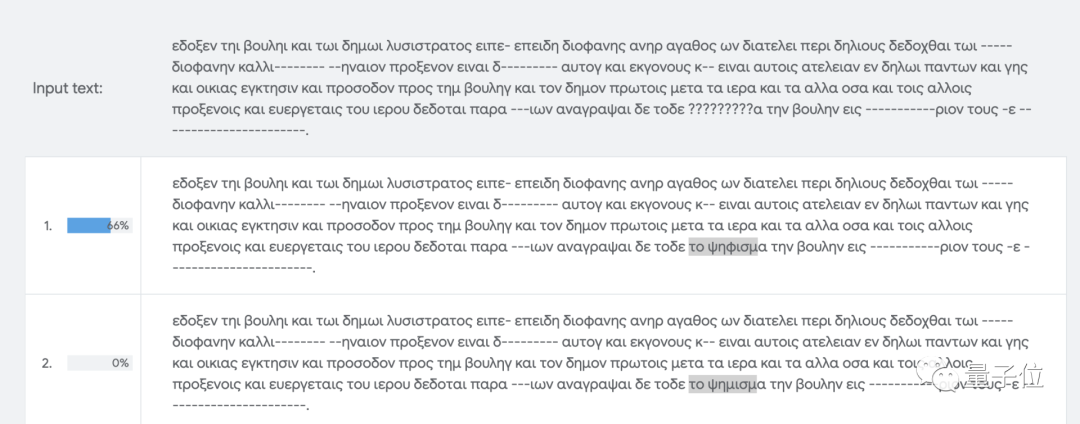 在文字修复任务中,Ithaca会提供20个按概率排列的解析结果预测: