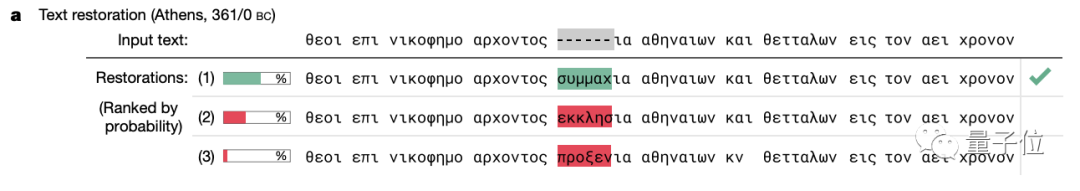 在实际应用中,历史学家单独破译某块古希腊石碑的准确率本来只有25%,但在使用这一方法后一举提升了近乎3倍,达到了72%。