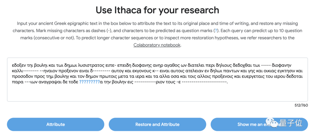 Ithaca现在提供了在线试用的途径,登录官网,在方框中中输入古希腊铭文,将缺少的字符标记为破折号(-)),将预测的字符标记为问号(?)。