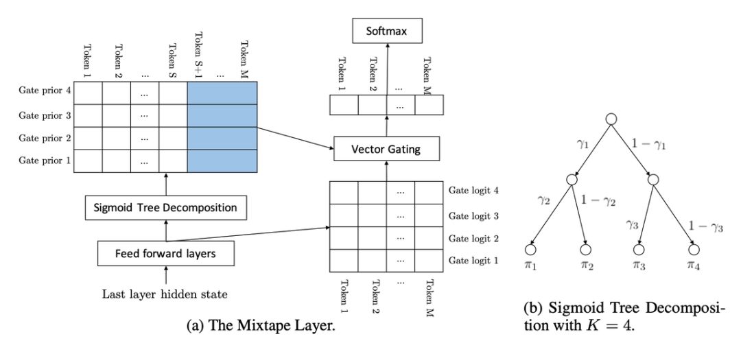 使用 sigmoid 树分解,计算公式 (3) 中的门控先验 π_c,x,k;