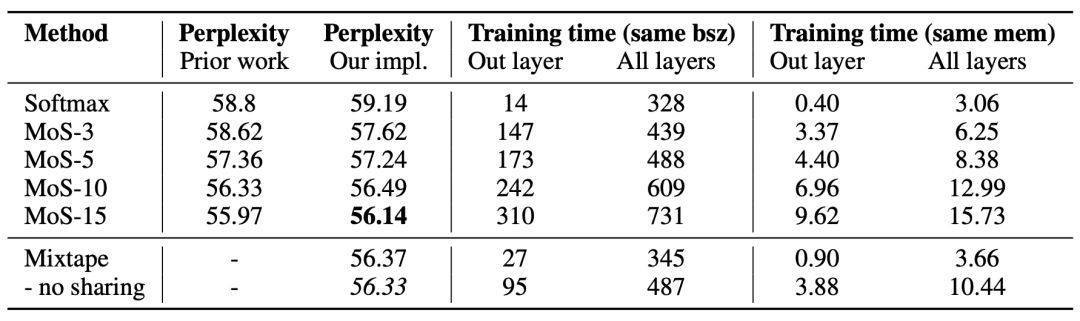 研究者对比了 Mixtape、MoS 和 softmax 的困惑度、翻译质量、速度和内存约束,证明 Mixtape 能够在效果和效率之间做好权衡;