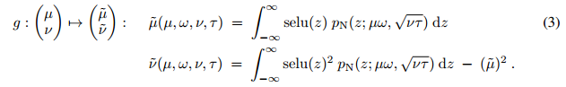我们假设 xi 之间相互独立,并且有相同的均值µ 和方差 ν,当然独立性假设通常得不到满足。我们将在后面详细描述独立性假设。函数 g 将前一层神经网络激励值的均值和方差映射到下一层中激励值 y 的均值µ˜ = E(y) 和方差ν˜ = Var(y) 中: