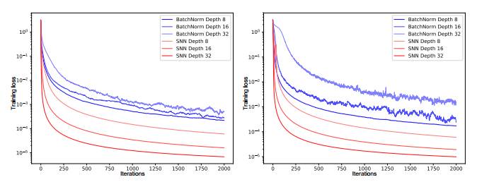图 1:左边图表和右边图表的 y 轴展示了带有批归一化(BatchNorm)和自归一化(SNN)的前馈神经网络(FNN)的训练损失,x 轴代表迭代次数,该训练在 MNIST 数据集和 CIFAR10 数据集上完成。我们测试的神经网络有 8、16 和 32 层,且学习率为 1e-5。采用批归一化的 FNN 由于扰动出现了较大的方差,但 SNN 并不会出现较大的方差,因此 SNN 对扰动会更加鲁棒,同时学习的速度也会更加迅速。