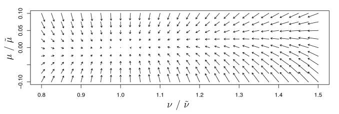 图 2:对于ω = 0 和 τ = 1,上图描述了将均值µ(x 轴)和方差 v(y 轴)映射到下一层的均值 µ˜和方差ν˜。箭头展示了由 g : (µ, ν) → (˜µ, ν˜) 映射的 (µ, ν) 的方向。映射 g 的不动点为 (0, 1)。