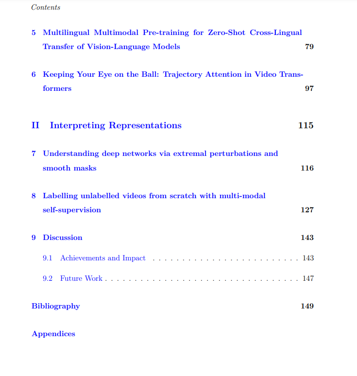 深度学习在多个领域都取得了突破性进展,从图像、语言和视频理解等核心机器学习任务,到医疗、自动驾驶和农业等现实行业。它的成功是通过为神经网络提供人工监督,从大型标记数据集(如ImageNet)自动学习分层数据表示。然而,获取大规模的标签数据通常是一个非常耗时和昂贵的过程。为应对这一挑战,本文挑战多模态视频数据的自监督极限。视频数据通常包含多种形式,如图像、音频、转录语音和可免费获得的文本标题。这些模态通常共享冗余语义信息,因此可以作为伪标签来监督彼此进行表示学习,而不需要使用人工标签。在不依赖标签数据的情况下,我们能够在从互联网收集的数百万个视频剪辑的非常大规模的视频数据上训练这些深度表示。通过在各种领域建立新的最先进的性能,展示了多模态自监督的可扩展性好处:视频动作识别、文本到视频检索、文本到图像检索和音频分类。我们还引入了数据转换、模型架构和损失函数方面的其他技术创新,以使用多模态自监督进一步改进对这些深度视频表示的学习。本文的第二个贡献是改进深度表示的可解释性的新工具,因为要破译这些深度表示中编码的关键特征是非常困难的。对于图像,我们展示了如何使用摄动分析来分析网络的中间表示。对于视频,我们提出了一种新的聚类方法,使用Sinkhorn-Knopp算法将深度视频表示映射到人类可解释的语义伪标签。本论文的研究成果为进一步提高深度视频表示学习的可扩展性和可解释性做出了贡献。
