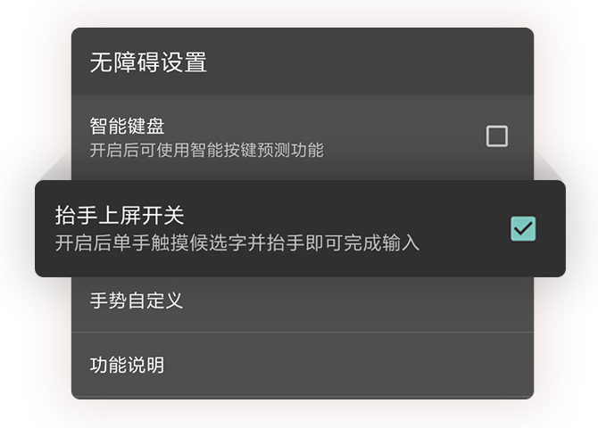 在无障碍模式下,输入法提供了独有的双指滑动选词手势。