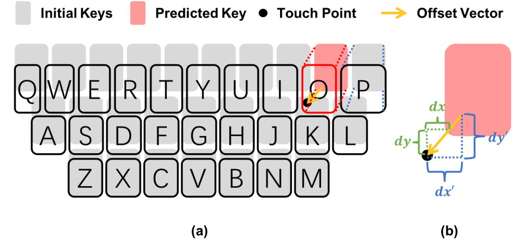第1步:计算触摸位置和初始布局中最有意向的键之间的偏移向量,也就是从键的边界到触摸位置的最小路径。