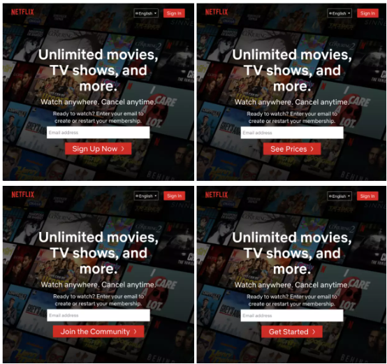 Netflix 特别喜欢 A/B 测试。上图所示,为公司主页欢迎词的四版测试稿