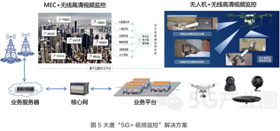 不论是采用无线高清视频监控器还是带摄像头的无人机,采集的视频信息即可通过 5G 网络实时回传,并在移动边缘计算服务器中进行图像识别、地理信息等数据处理和分析,为监控中心提供预测预警、实时监控、轨迹追踪、快速检索等服务。