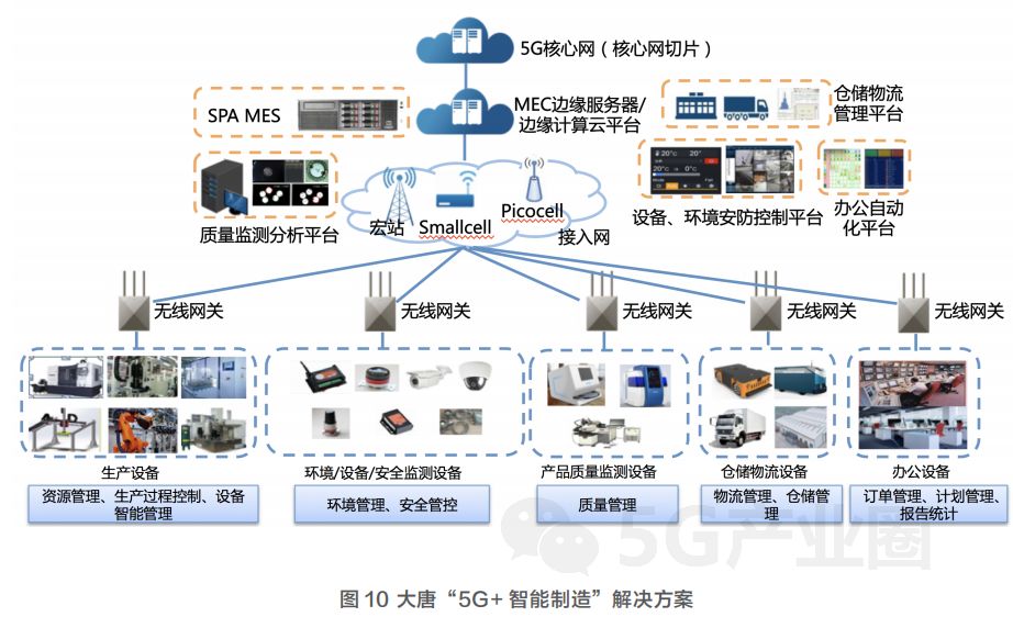 大唐“5G +智能制造”解决方案,以流程自动化、计算智能化为核心,通过 5G 网络、大数据、移动边缘计算等核心技术,整合装配信息、测试结果、操作人员信息、产品信息、工站信息、订单信息与工序等信息,实现车间现场数据收集采集、制造过程管理、质量 SPC 分析、设备 /环境 / 能源监控、远程运维、仓储物料管理、产品溯源、批次跟踪、个性定制、制造能力交易以及库存管理、车辆物流资产管控等功能,实现制造过程的智能控制、运营优化,并实现生产组织方式的变革。