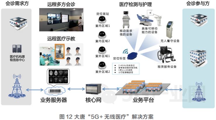 大唐“5G+ 无线医疗”解决方案基于 5G 物联网技术、可承载医疗设备和移动用户的全连接网络,对无线监护、无线输液监护、移动护理和患者实时位置等数据进行采集与监测,并在医院内业务服务器上进行分析处理,提升医护效率、降低人工出错概率。