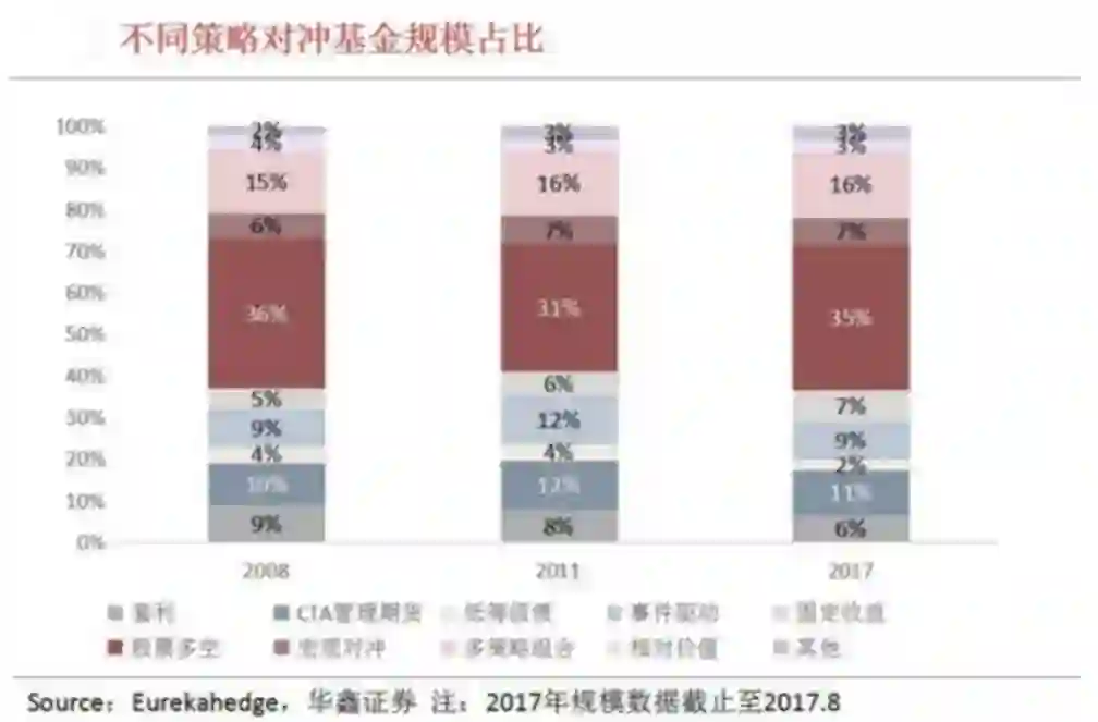 为何说量化3.0时代即将到来呢?原来国际上主流的Hedge Fund的所用的量化策略都不是用股指期货对冲的,不论是以价量因子闻名的World Quant还是基本面大佬AQR,用的都是股票多空策略(Long/Short),而用股指期货对冲的策略严格来说只能是半个多空策略,因为不能获取做空的收益,就像赛跑中只能用一只脚跑步一样。根据知名数据商Eurekahedge的统计数据,国际对冲基金中长期占比第一(一直超过30%)的是多空策略。