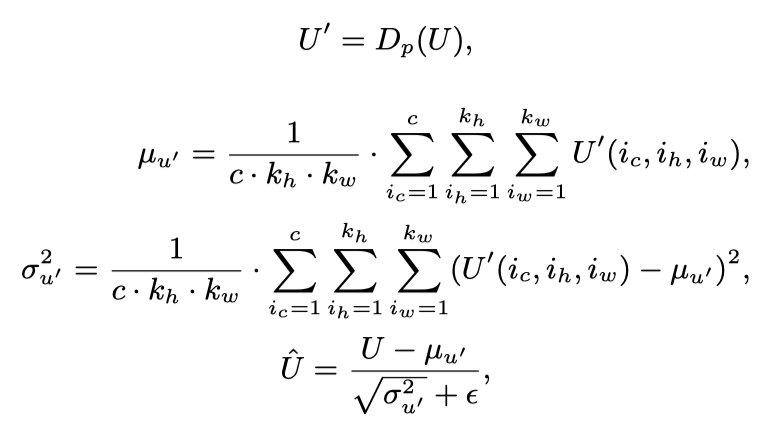 式中,p 是 dropout 概率, 是 dropout 操作,U 是归一化单位, 是 dropped-out 单位, 和 区域和 dropout 单位的平均值和方差, 是 normalized 单位。KernelNorm 在训练过程中引入了正则化效果,通过使用对 dropped-out 单元 ′ 计算的统计量,归一化原始单元 U 的元素,提高了模型的泛化能力。