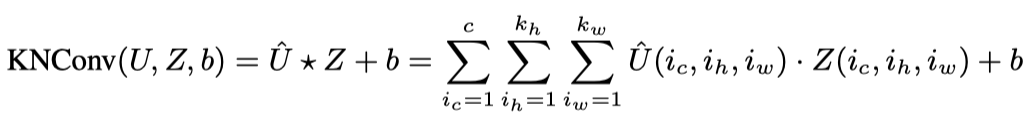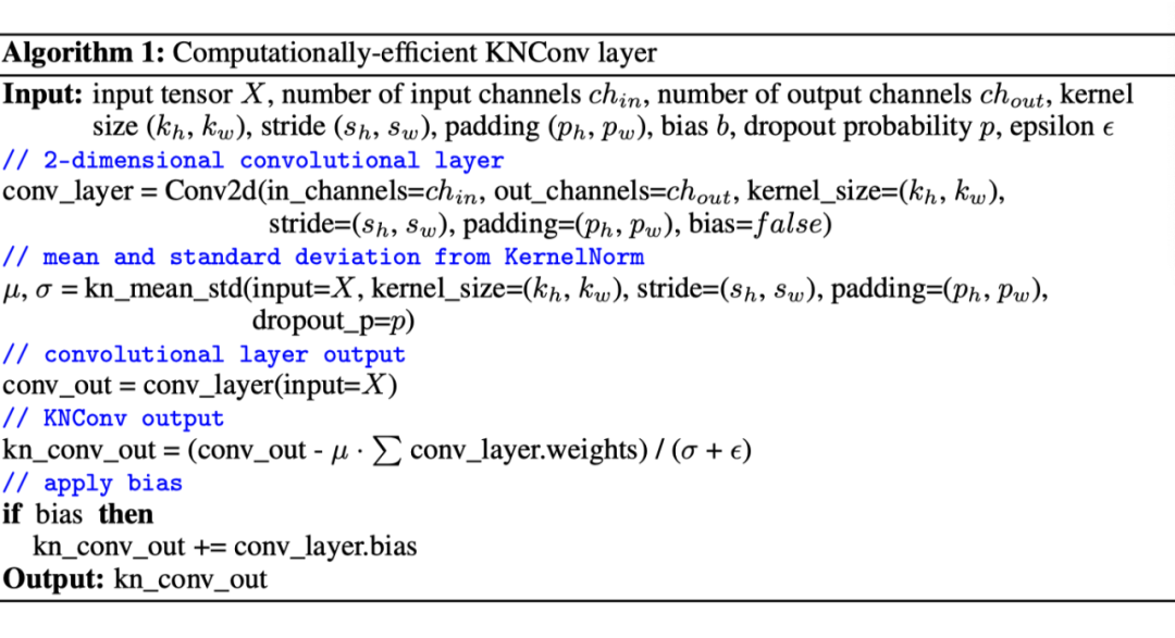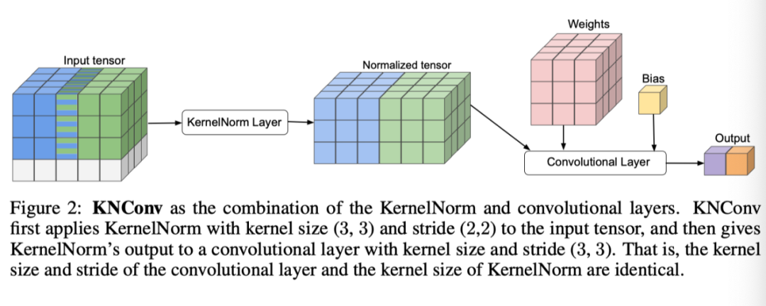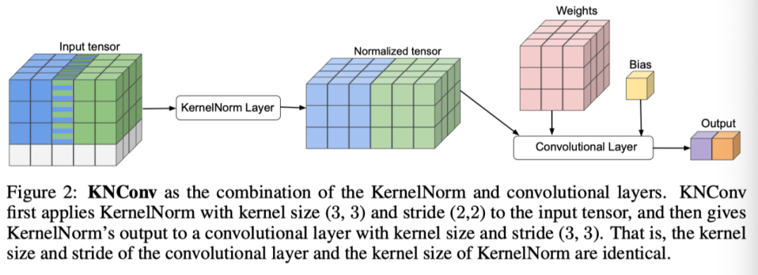 如上图所示,KNConv 是 KernelNorm 和传统卷积层的组合。它采用与卷积层完全相同的输入通道数 、输出通道数 、核大小 、步长 和 padding 以及 dropout 概率 p 作为超参数。KNConv 首先将带有核大小、步长、padding 和 dropout 概率 p 的 KernelNorm 应用于输入张量。
