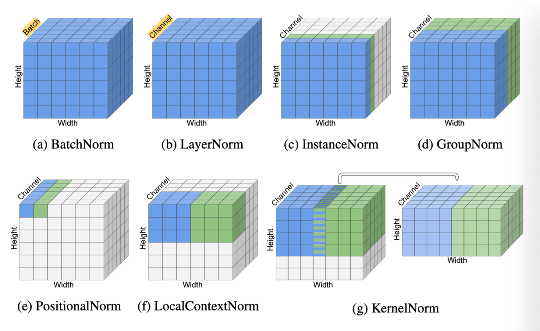 KernelNorm 将核大小 、步长 、填充 和 dropout 概率 p 作为超参数。如果指定了 padding,则用零填充输入。KernelNorm 沿着通道、高度和宽度维度执行规范化,但与 batch 维度无关(上图g)。KernelNorm 沿着通道、高度和宽度维度执行归一化,但独立于 Batch 维度。