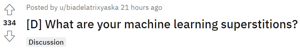 原贴地址:https://www.reddit.com/r/MachineLearning/comments/rkewa3/d_what_are_your_machine_learning_superstitions/?sort=confidence