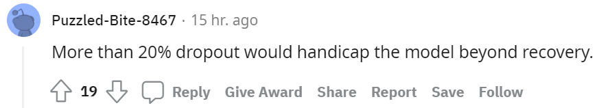还有网友晒出了自己的 dropout 经验,认为超过 20% 的 dropout 将使该模式难以恢复。不过这只是这位网友自己的经验,也有人表示自己采用 90% 的 dropout,模型性能最好。