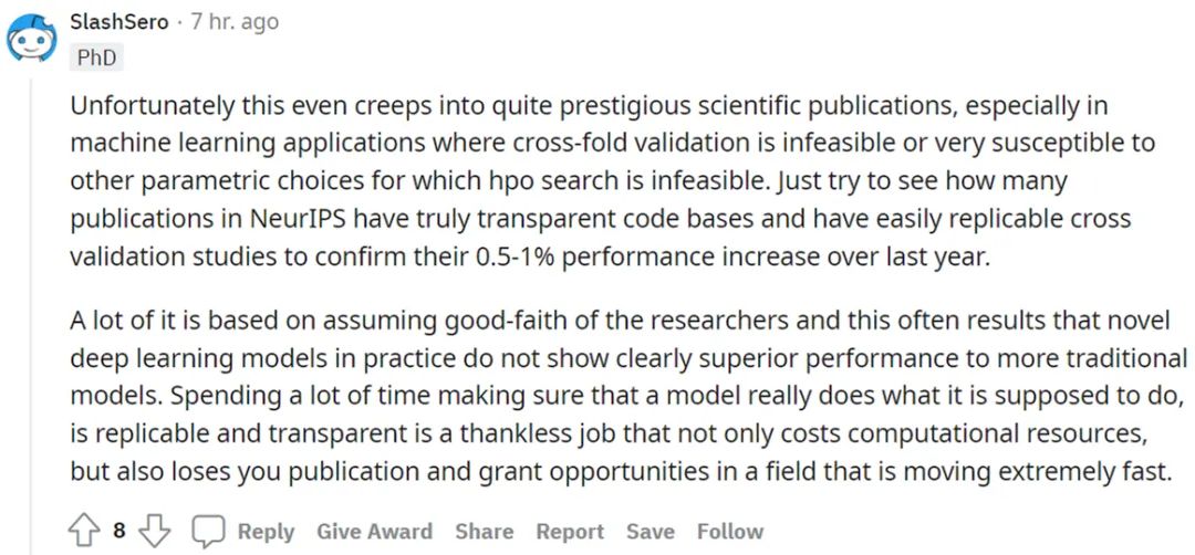 不过,也有网友对这一经验总结持怀疑态度:网友 @SlashSero 遗憾地表示,这种情况甚至会出现在非常有名的科学出版物上,尤其是在交叉验证不可行或者易受其他参数选择影响的机器学习应用中,因此超参数优化(HPO)不可行。不妨看看 NeurIPS 会议论文有多少拥有真正透明的代码库和易于复现的交叉验证研究,以证实他们的工作较去年提升了 0.5-1% 的性能。