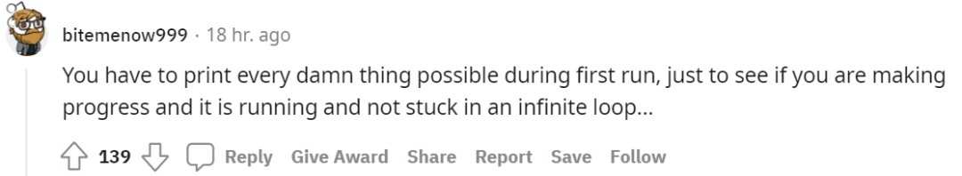 模型的训练过程,近乎黑盒,假如期间发生程序错误,很难察觉到,有网友建议随时随地进行「print」是一个很好的习惯,在程序第一次运行时,一定要打印所有可能的东西,「print」能让你知道程序进行到哪一步,有没有陷入死循环...... 其实,绝大多数程序员都会这样做。