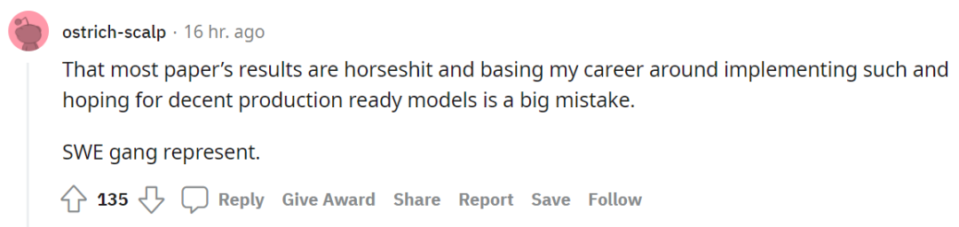 虽然调参有用,但网友 @ostrich-scalp 犀利地批驳道,「大多数论文的结果都是胡说八道,将我的职业生涯都用来实现这些工作并期望创建像模像样可用于生产的模型,这是一个极大的错误。」