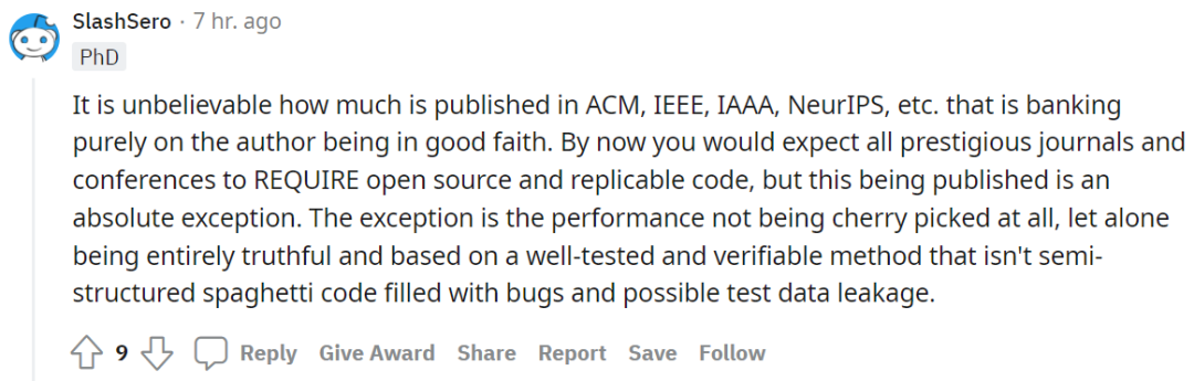 上面那位老哥 @SlashSero 接茬说道,「令人难以置信的是,ACM、IEEE、IAAA 和 NeurIPS 上发表的论文有多少完全只是出于对作者的信任。到现在为止,你可能希望所有知名期刊和会议都要求论文作者开源和复现代码,但这种情况只是例外。」
