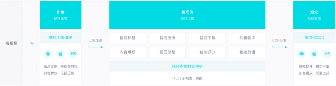 比如就短视频而言,就是「如何再造一个抖音」的一站式解决方案了。集合内容生产(采编)、视觉特效、媒资管理、分发消费、质量分析等功能,提供短视频制作工具、质量控制、缓存策略、编解码技术等,能够帮助企业快速搭建抖音级体验的短视频 App。